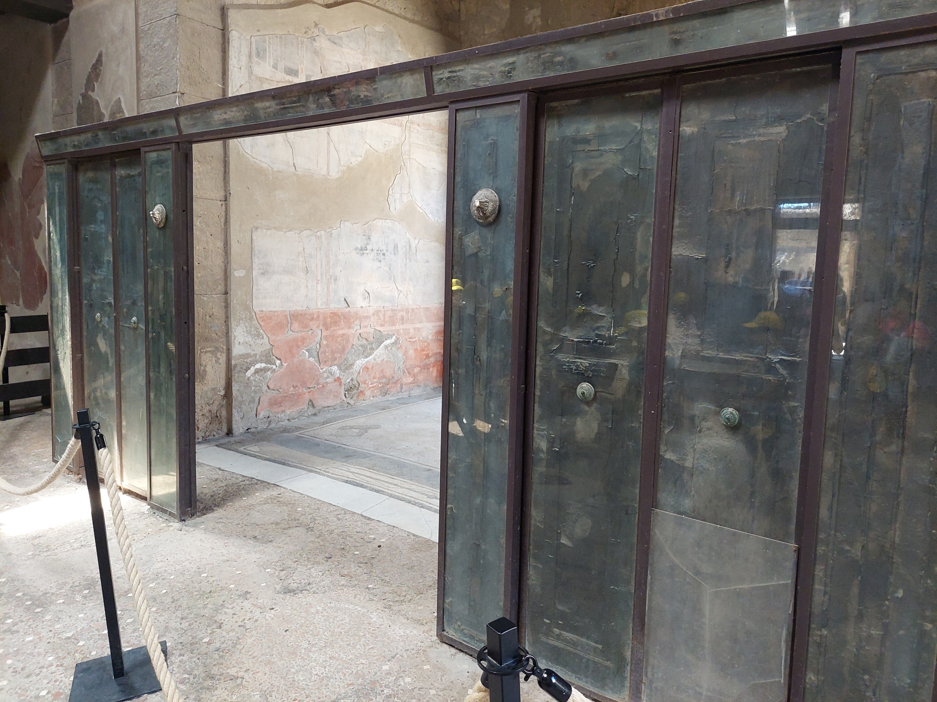 Schiebtür zum Abtrennen eines Bereichs des Atriums, Holz mit Bronzebeschlägen, konserviert durch Vesuv-Ausbruch 79 n. Chr., Parco Archeologico di Ercolano
